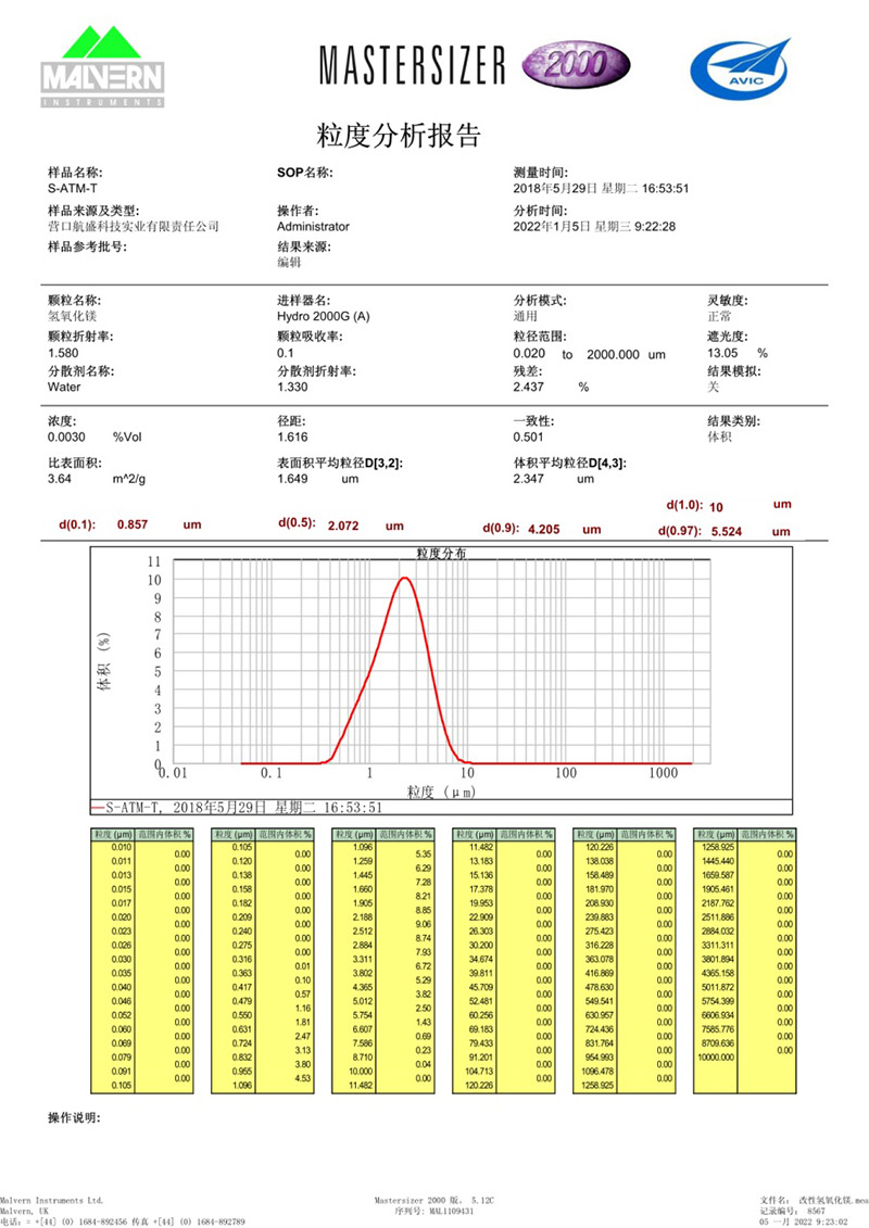 化學(xué)法氫氧化鎂8000目改性后典型馬爾文粒度分布圖: