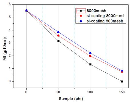 使用硬脂酸和硅烷改性后對(duì)熔體流動(dòng)速率有顯著提升,硅烷效果優(yōu)于硬脂酸