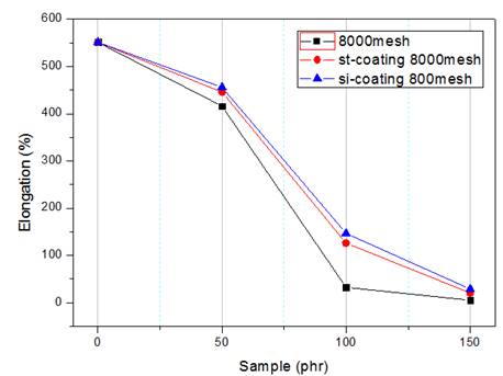 使用硬脂酸和硅烷改性后對(duì)斷裂伸長(zhǎng)率有顯著提升,硅烷效果優(yōu)于硬脂酸